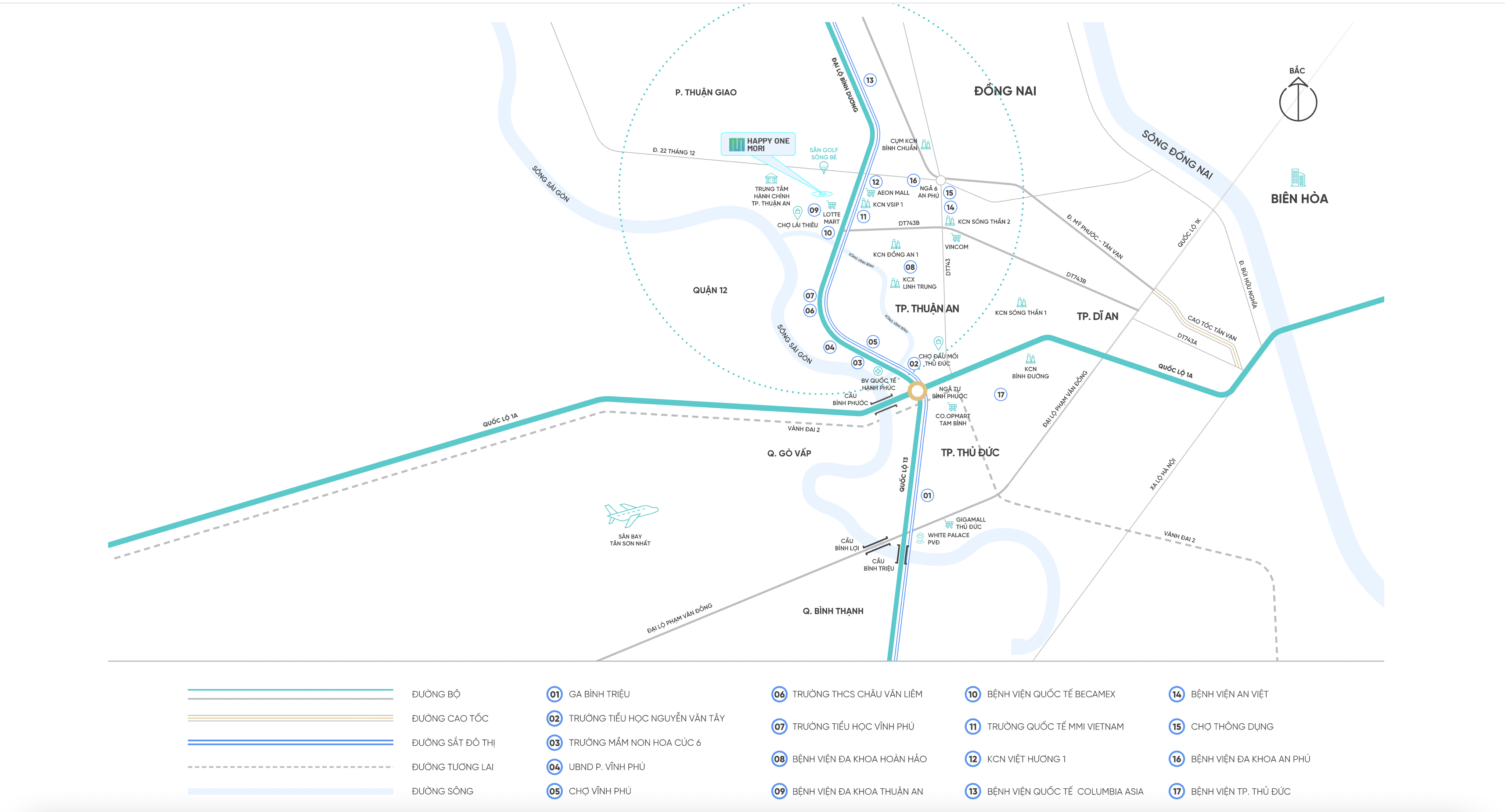 Happy One Mori tọa lạc ngay trục đường Lái Thiêu 14 giao Nguyễn Văn Tiết – tuyến huyết mạch kết nối TP. Thuận An với TP.HCM, TP. Thủ Đức, Dĩ An, Thủ Dầu Một… Vị trí này giúp cư dân di chuyển thuận tiện và nhanh chóng tiếp cận chuỗi tiện ích ngoại khu đa dạng: siêu thị, trường học, bệnh viện, ngân hàng.