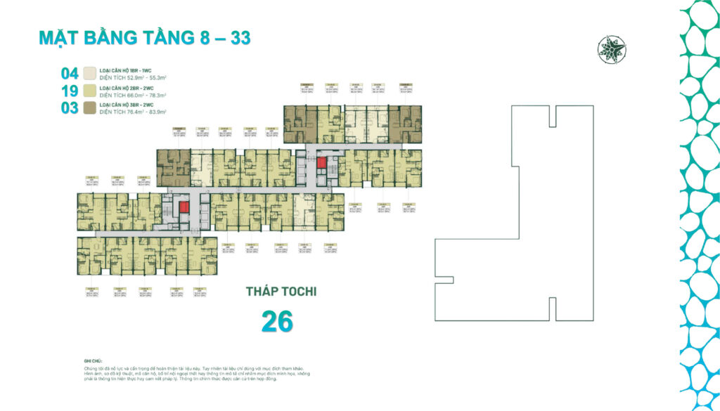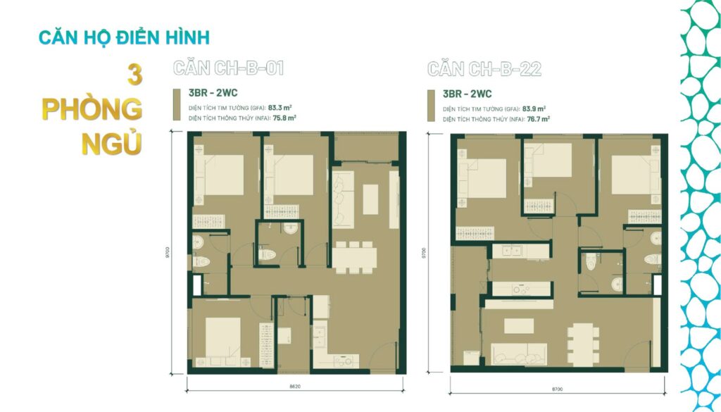 • Căn hộ 3PN-2WC: ~85-105 m²