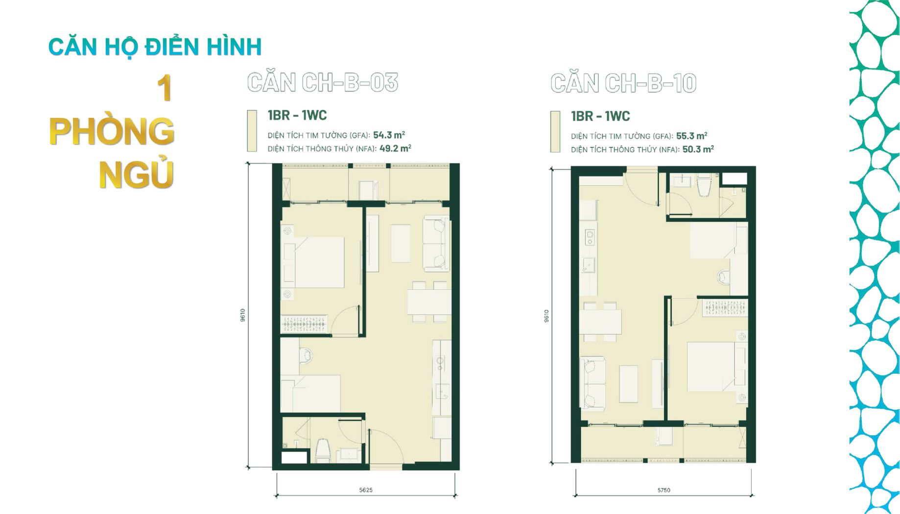 • Căn hộ 1PN +: ~49-55 m²